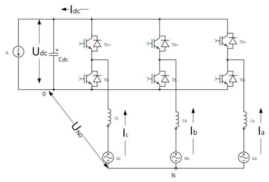 The schematic of the modeled converter is shown in Figure 2. It is a typical three-phase full bridge converter that can act as a boost type PFC rectifier, or an inverter depending on the directional of energy flow. The load in the system on the dc side is represented as a current source IL that can come from the battery bank or the vehicle battery and can be both positive or negative.