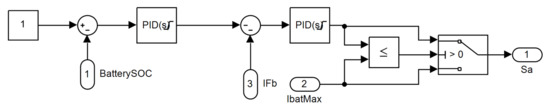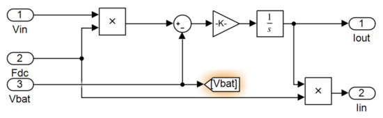 When in state 2 (the battery is charged) the control subsystem is shown in Figure 10. The control algorithm charges the battery to 100% SOC with current that is not more than the maximum available. This maximum available current (IbatMax) is calculated by dividing the difference between the consumed and generated power and the dc bus voltage.