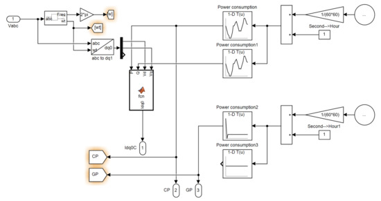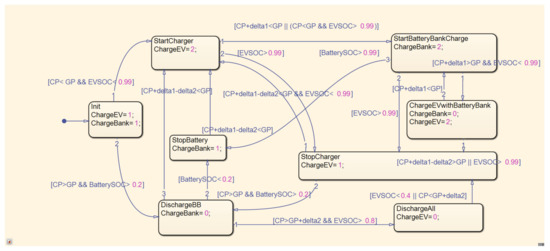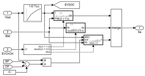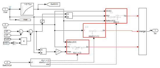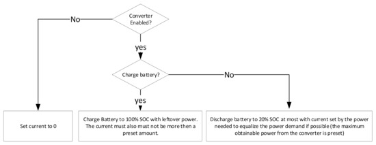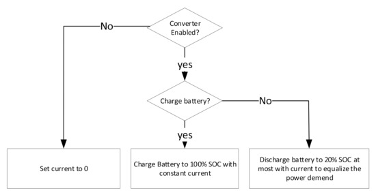 The main difference is that when the vehicle is charging its battery (state 2) the consumed power is assumed to be constant as usually the onboard charger has fixed power capabilities. When the battery is discharged the current reference is calculated as the power required from the vehicle (the power set to be consumed by the mains minus the required one from the household and the current one supplied from the battery bank) divided by the dc bus voltage. A simple flowchart that presents the developed model is shown in Figure 13.