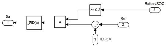 As was discussed in the overall control design goal there are three states that the converter can be—off, u = 1; charging the battery, u = 2; or discharging the battery and returning energy to the dc bus, u = 0. The control in each of these cases is made by independent subblocks. A flowchart that shows the basic operation of the control system is shown in Figure 8, while the implemented control algorithm in Figure 9.