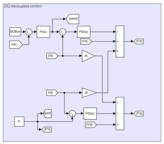 The control system for the converter is the standard decoupled control presented in Figure 14 [6]. The main idea behind this control algorithm is to remove the disturbance from and parts and obtain a simplified dependence of current charging the output capacitor only from the DQ transformed currents (that are the control goal). The refences for the Id and Iq currents can be set accordingly to control the Active and Reactive power consumed from the ac bus. As for the current application (small households) the reactive power is not measured, so the Iq and I0 current references are set to zero.