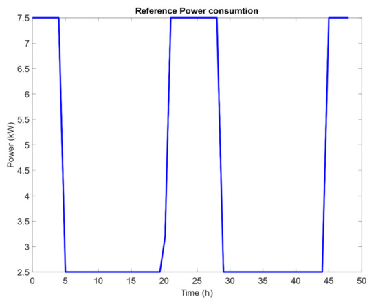 As the battery of the EV is charged during the second day, this allows for its use in load balancing during the peak consumption during the end of the day (around 44 h, and shortly around 35 h) and this allows the system to consume only the reference power from the grid during the day.