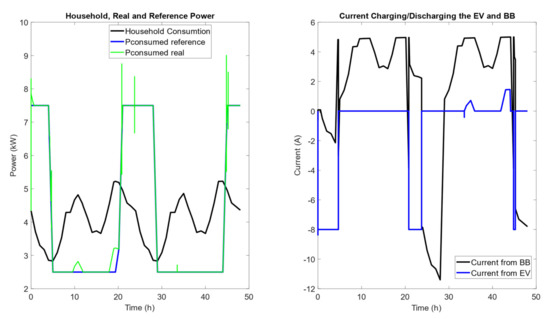 Waveforms for the Ordered (blue) and real consumed power compared to the real power consumption of the load (black) based on a 2-day period simulation data from the model are shown in Figure 17. On the left of the graph the back is the real ac consumption of the household (as per Figure 15). On the right side are the currents from the two energy sources. If the current is positive, then power is consumed from the energy source. This means for example that during the first day (5 h to 18 h) power is consumed from the battery bank in order to balance the power demand. The graph also shows the current from the electric vehicle battery. Again, negative values mean that current is delivered (for example during the first night (0 to 5 h).