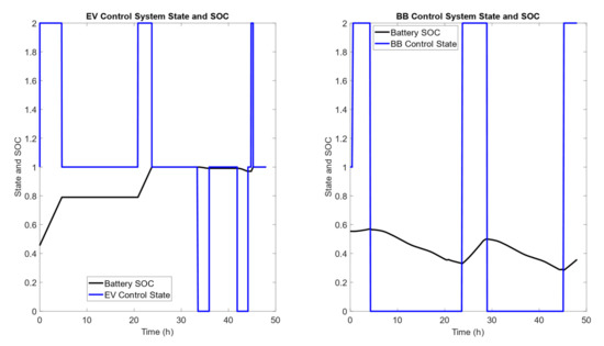 System state and Battery SOC the (left) EV converter, (right) battery bank.