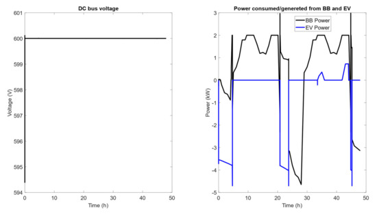(left) DC bus voltage and (right) energy supplied (positive) and returned to the battery of the EV (red) and Battery Bank (black) in (kW).
