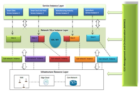 The service layer consists of specific services that are supported by the network operator or third party. It is linked to management and network orchestration (MANO) via an interface that allows it to create the dedicated slices for the specific application. The 5G network slicing architecture is shown in Figure 1. The services layer shows the supported applications and each application is depicted as a service instance.