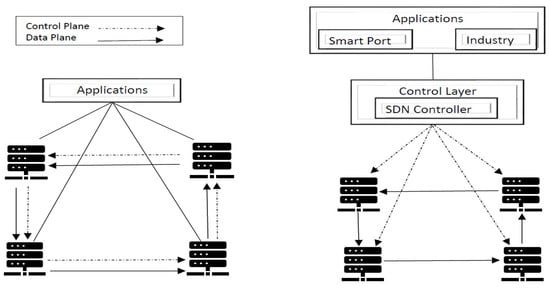 The purpose of SDN is to replace the existing networking system with programmable services by separating the data plane and control plane (CP) [14]. It offers the flexibility, security, and less operating cost as compared to a traditional network. Due to the centralized architecture, it is easy to manage and run the operations across the larger network. The control plane is easy to configure, as it provides useful management functions. Controllers help to forward the packets in an SDN via APIs. A comparison of the existing network and SDN is shown in Figure 2. SDN is lean to undertake the traditional network issues by offering the centralized programmable services, which are well suited for the heterogeneous environment. The controller in SDN organizes the slicing of the network instance by using the protocols. It helps to create the client and server environment along with the installation of their concerned protocols as defined in the Open Network Foundation (ONF) SDN architecture [15]. SDN also offers the ability to promptly answer to the changing network environments and enterprise community.