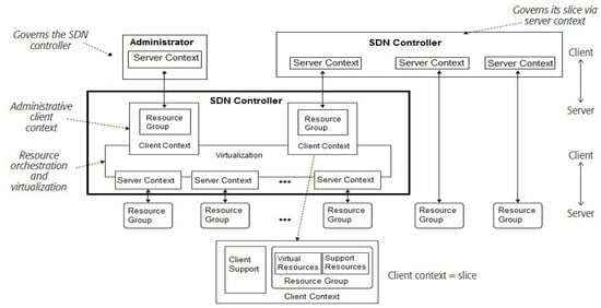 ONF SDN architecture is ideal for 5G network slicing because it meets the application services requirements in an effective manner, as the CP dynamically configures the data plane resources to carry out customized services to the application plane. As described in [16], controllers and resources (e.g., infrastructure resources) are envisioned as key elements. A controller is defined as a programmable centralized unit, which manages the resources in an effective manner and delivers services to the underlying data plane. As shown in Figure 3, controllers are an essential part of the architecture, as they form a link between clients and resources via client and server contexts. A controller needs all the details to mediate with a respective client. The client context consists of the resource group and support function. Moreover, the resource group provides responsive approach and enable its connection with the controller. Comparisons of different SDN controllers has been shown in Table 1. Client operations are supported by the client support function, based on protocols that enable the clients to interact with the controller. A controller needs all the details from the server context in order to mediate with the respective resources. The controller performs the virtualization and the clustering of the underlying resources. Orchestration enables the controller to dynamically forward the respective resources to different resource groups. Controllers are connected to applications and resources via northbound interface and southbound interface, respectively. These interfaces help users and applications to connect with the network.