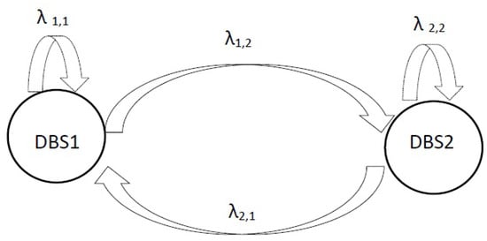 Discrete-time Markov Chain with 2 states (i.e., DBSs), only states 1, 2 are shown for readability.