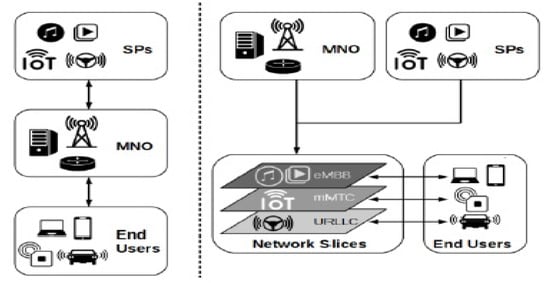 Network slicing will provide flexibility, heterogeneity, and scalability; on the other hand, network resources need to be highly manageable. Resource management in network slicing can be an issue and it can be addressed by applying the ML techniques. Network slicing can improve the resource efficiency by separating the infrastructure resources and network functions. In the past, network operators manages the network services by themselves but now due to network slicing they can lease them to multiple tenants. Tenants can deliver the network services to the end customers without the need of having their own infrastructure. In Figure 7, difference between existing unsliced and sliced network is shown. This new model has opened the new business opportunities, this service is called as “slice-as-a-service” (SlaaS) [40].