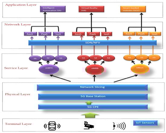 We grouped the model into five layers: terminal layer, physical layer, service layer, network layer, and application layer. The terminal layer is used to collect the data from the sensors and then these data are passed onto the physical layer via 5G-CPE wireless terminal. IoT devices need to be 5G-enabled in order to connect these IoT devices to a 5G base station. Thus, due to the resource limitations of IoT devices we can use 5G-CPE [48].