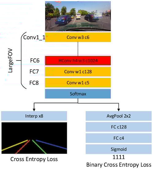 In the existing method, the encoder is usually a modified mainstream Convolutional Neural Network (CNN) [42,43]. For example, to preserve the spatial information of the target, VGGNet and ResNet will remove the maximum pooling layer of the last two stages in VGGNet and Resnet or modify the convolution step size to 1 and replace the standard convolution layer with hole convolution with a different void ratio, to obtain a larger receptive field. In addition, “FC6” and “FC7” fully connected convolution layer, as shown in Figure 1, are added. Their output with high-dimensional feature images enables the network to learn more abundant lane line features.