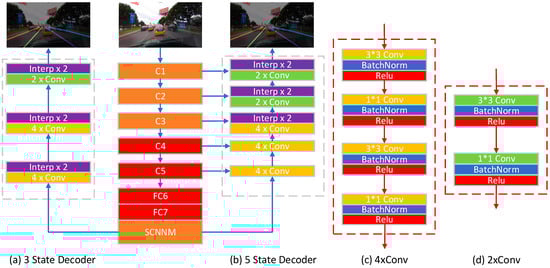 The design of the encoder structure in the lane line detection network determines the ability of the network to extract the target features, and the design of the decoder structure affects the ability to restore and predict the details of the target features. In order to explore the influence of different decoder structures on the feature prediction of recovery lane lines, this paper added decoders to the SCNN network. The decoder is designed with three stages, and its structure is shown in Figure 3a. The output of the encoder is directly refined by three times of convolution layer and two times of bilinear interpolation so that the resolution of the feature image is restored to the original image size. The structure of the 5-stage decoder is shown in Figure 3b. In addition to the above operations, also fully consider the different characteristics of the target feature expression at a different stage of the encoder. The decoder features of the later stage are used to guide the feature learning of the previous stage to recover the prediction of target details better. This decoder design can be applied to various lane line segmentation algorithms using the direct up-sampling method. In addition, when using ResNet as the backbone network, only four stages of decoders are needed. In Figure 3, “×” is used to define that how many convolutional layers we used, and “*” is used to define the convolutional kernel size we use in that specific layer.
