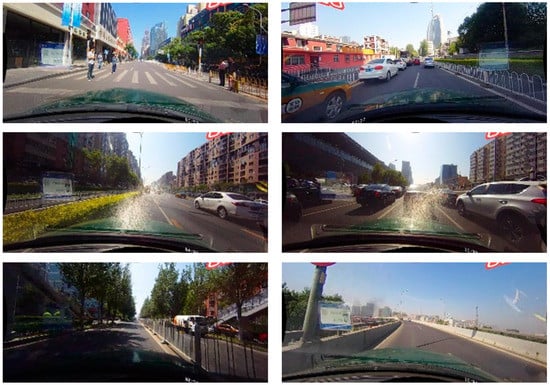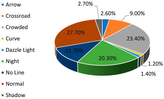 In this paper, we prefer to use the CuLane dataset [24]. Cameras were installed in six different vehicles driven by six different drivers and captured videos while driving in Beijing on various days. More than 55 h of video were collected, yielding 133,235 frames, more than 20 times the size of the TuSimple Dataset. The dataset was divided into 88,880 for preparation, 9675 for validation, and 34,680 for testing. These input images have a resolution of . We remove the sky and very close areas from the image and resize accordingly to the lane line network model. Our initial experiments found that traditional photometric and geometric recipes for data augmentation were not providing better driving results, so we do not use augmentation. Figure 4 depicts a variety of scenes, including urban, agricultural, and highway settings. As one of the world’s largest and most congested cities, Beijing presents many daunting traffic scenarios for lane line detection. The dataset was divided into two categories: standard and difficult, which correspond to the nine examples in Figure 4. The proportion of each scenario is shown in Figure 5. The eight difficult scenarios account for the majority of the dataset (72.3%). We manually annotate the traffic lane lines with cubic splines for each frame. As previously mentioned, lane markers are often obscured by automobiles or are not visible. Even in these difficult situations, lane line detection algorithms must estimate lane locations from the background in real-world applications. As a result, we continue to annotate the lanes according to the context in these situations, as shown in Figure 4.