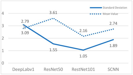 As shown in Figure 6, the improved of the four groups of comparative experiments in Table 3 in each scene were calculated, and their mean and standard deviation were calculated. It can be seen from the figure that the average value of the improvement is the highest in the Resnet50 method, and it can be found that the network performance of the decoder with a relatively simple structure is improved more obviously, which indicates the importance of the decoder for the prediction of lane line feature recovery, and also proves the effectiveness of the target feature distillation method. Additionally, in the Resnet101 method, the performance of each sub-scene has the closest improvement range, so the standard deviation of its improvement is the smallest, which may be due to its encoder’s strong feature expression ability, which enables it to extract lane line features in each traffic scene effectively.