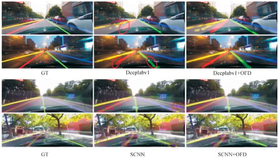 The target feature distillation method was applied to DeepLabv1 and SCNN methods, and lane line detection results before and after application were compared. As shown in Figure 7, column 1 represents the actual label of the input image. The images in column 2 represent the results without using the target feature distillation method. The image in column 3 represents the experimental results after applying the method. By comparing the lane line detection results at the red circle in column 2 image of the DeepLabv1 method, it can be seen that the target feature distillation method can more effectively recover the prediction of lane line pixels in congestion and night scenes. From the red circle in the lower right corner of the SCNN prediction result image, it can be seen that the method presented in this paper can effectively reduce the false detection rate of lane lines on the shadow road without clear lane line identification.