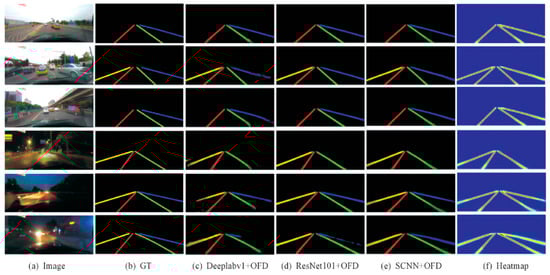 Figure 8 shows lane line detection results after each algorithm applying the proposed method in different complex road scenarios of the CuLane dataset. Column 1 is the original image input, column 2 is the corresponding segmented image, and column 3–5 is the probability graph of lane line segmentation of each algorithm. To better see the probability of lane line classification, the probability diagram of the SCNN network in the fifth column is visualized by a heat map and displayed in the last column. The blue represents the minimum probability value, and the red represents the maximum. From left to right, as the algorithm complexity increases, the lane line boundary segmentation and lane line continuity in the lane line classification probability diagram get better and better. In particular, as the visualization result of line 6 in Figure 8 shows, with the enhancement of the network’s ability to extract lane line features, the detection effect of the blue lane line on the right of the figure gets better and better. In addition, as shown in lines 4–6 in Figure 8, the method proposed in this paper can effectively detect lane lines under harsh conditions with no obvious illumination at night.