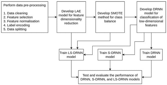 In this section, we implement and evaluate the effectiveness of DRNN, S-DRNN, and LS-DRNN models with the Bot-IoT data set []. The research methodology involves data pre-processing, model development, and model evaluation, as shown in Figure 1.