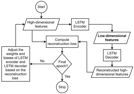 A high-dimensional network traffic feature set is represented with , where n is the total number of network traffic samples, and a is the feature dimensionality. This matrix was reshaped to form a sequential 3D tensor, . LSTM is a recurrent neural network which learns latent space representation of network traffic features using input gate, forget gate, memory cell state, output gate, and hidden state. A single LSTM layer was used to reduce the dimensionality of the feature set based on Equations (1)–(6):
