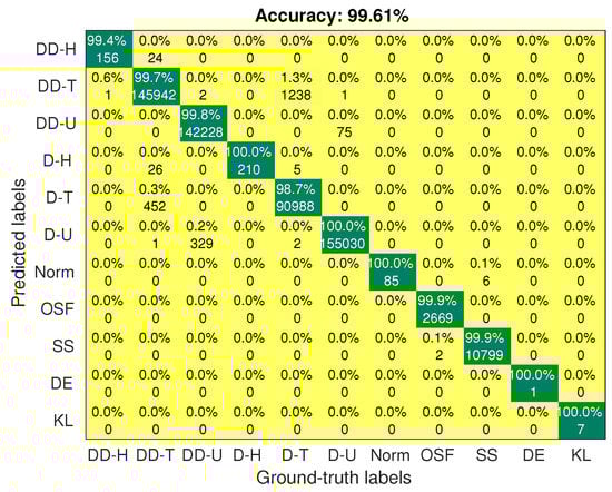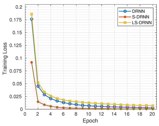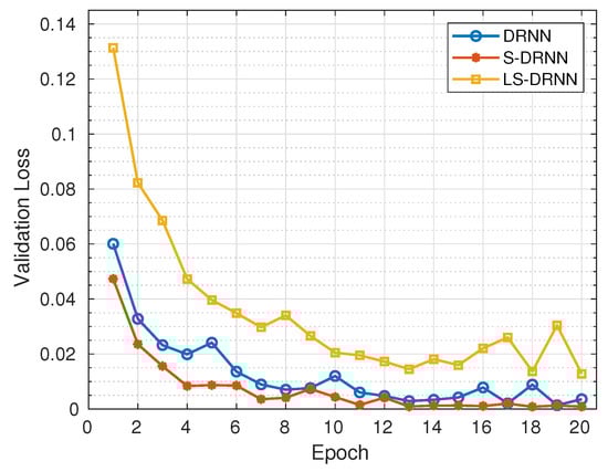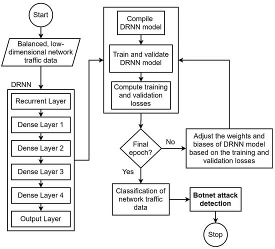 - DRNN, S-DRNN, and LS-DRNN models are trained, validated, and tested with network traffic samples in the Bot-IoT dataset [], and their classification performance in 11-class classification scenario is evaluated.