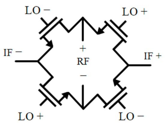 This study focuses on passive mixers, which are widely used in the current state of the art for integrated communication systems in nanometer CMOS processes. Despite their incapability to provide gain, their performance in terms of figure noise, linearity, and power consumption exceeds those of the active alternatives []. The following conversion schemes are based on a MOS passive ring mixer (see Figure 1), implemented in nanometer CMOS technology.