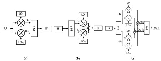 On the other hand, in a double quadrature scheme (Figure 2c), four mixers are employed. A PPF decomposes the input signal, either RF (downconversion) or IF (upconversion), in quadrature form and each component is multiplied by LOI and LOQ. The outputs are combined as OUTI = INI·LOI + INQ·LOQ and OUTQ = INI·LOQ − INQ·LOI and, finally, another PPF recomposes the quadrature signal to differential mode. This more complex architecture virtually relaxes the requirements on the components at the cost of requiring more elements.