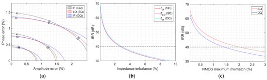 IRR curves in upconversion for simple quadrature (SQ) and double quadrature (DQ) schemes: (a) Imperfect input quadrature. LO amplitude and phase errors are self-corrected in the double quadrature scheme; hence, their curves are not drawn. (b) Impact of impedance imbalance. Mismatches in ZRF and ZLO (DQ) are negligible by comparison. (c) Worst mismatch scenario in the mixer’s NMOS W/L ratio.