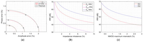Although the IRR is virtually infinite under ideal balance operation conditions, i.e., assuming ideal quadrature of the input signal [], balanced source and load impedances [], and no device mismatches [], this is not a realistic scenario. In practice, non-idealities of real components, such as parasitics and variations resulting from the fabrication process, will unbalance one or more of these ideal conditions, and hence they will affect the IRR. This degradation only depends on the imbalance regardless of the cause. Thus, this analysis benefits from this induction and studies how deviations from the ideal balance operation conditions affect the IRR to estimate the effect of any non-ideality.