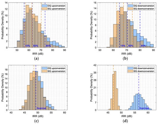 Additionally, the histograms from downconversion present a similar distribution for both schemes (represented in Figure 5b), although, in this case, the double quadrature scheme shows greater robustness against worst-mismatch combination IRR degradation than the single quadrature scheme (see Figure 4c).