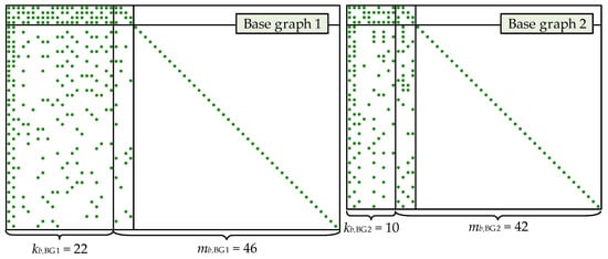 The most common structured LDPC family is known as quasi-cyclic (QC) LDPC codes [6,7,8]. Their PCM consists of circularly shifted identity submatrices or square zero submatrices. Such submatrices are frequently called circulant permutation matrices (CPM) [8,9]. The size of CPMs is referred to as lifting size or lifting factor (Z) [5]. QC–LDPC codes are usually designed based on the so-called base graph (BG) matrix, which defines a macroscopic structure of a code. The final PCM is constructed by placing CPMs at appropriate positions defined by the BG matrix. Since CPMs are either circularly shifted identity matrices or zero matrices, the PCM can be stored as a matrix of integer numbers that represent corresponding shift values or zero matrix identification. Such description is frequently called a permutation matrix [7] or exponent matrix [9] and is very much convenient for 5G NR since the number of supported codes is very high. The great diversity of code rates and codeword lengths additionally requires a unification of code descriptions; therefore, the representation using exponent matrices is essential [5,9].
