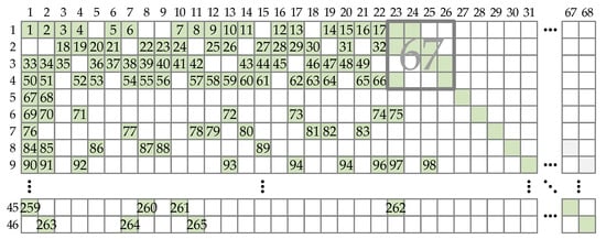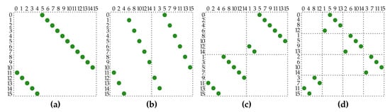 In (12), hj,k represents a single CPM in QC–LDPC code’s PCM, which can be either circularly shifted identity matrix or zero matrix, kb is the number of information bit groups each of which has Z bits, whereas the mb is the number of parity check equation groups each of which contains Z parity check equations. I is an identity matrix. In general, represents any matrix circularly shifted by s. The matrix is circularly shifted by circularly shifting each of its sub vectors. A described deterministic PCM form can be exploited to implement low-area encoders based on a forward substitution (FS) [30,31,32,33,34].