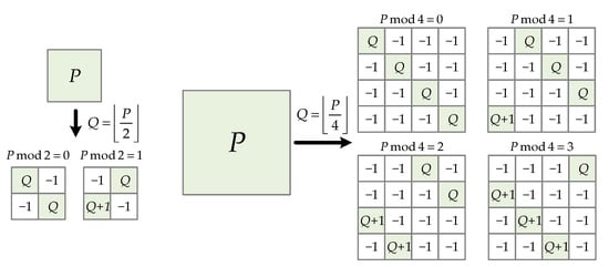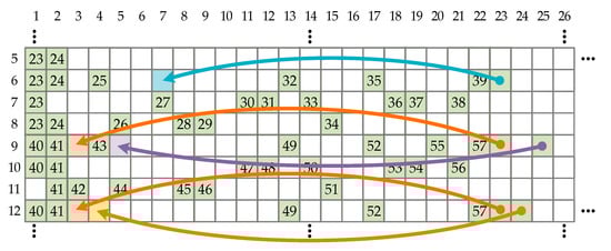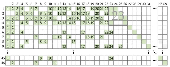 Although PCM has a structure designed to support decoder efficiency, it can be processed in a way that is optimal for the encoder. For example, the sixth-row group shown in Figure 5 uses almost the same information and core parity bits as the ninth-row group. A significantly higher efficiency would be obtained if the sixth and ninth rows are processed together. Consequently, instead of conventionally processing adjacent rows groups in parallel, the encoding can be accomplished by processing the rows that use the same or at least almost the same information and core parity bits. Therefore, the proposed encoding schedule can be optimized for better hardware efficiency. A method for obtaining the optimal schedule is described in Section 4.2.