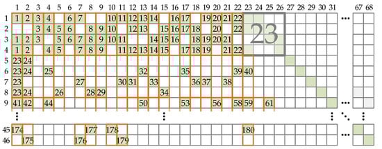 Partially parallel processing can be conducted in multiple ways. If only one CS is used, the encoding is performed serially by processing one CPM at a time. Note that this encoding is still partially parallel since the CS takes the entire vector of Z bits. Figure 2 shows such architecture’s encoding schedule. The schedule is shown for BG1 codes since BG2 codes have a similar structure but a smaller number of CPMs in the PCM. In Figure 2, numbers at CPM positions represent ordinals of clock cycles in which the corresponding CPMs are processed. In the beginning, the encoder takes information bit groups that correspond to the first four base graph rows necessary for the calculation of vectors λ1, λ2, λ3, and λ4. Based on calculated λ vectors, core parity bits are computed as in (28) or as in (30) and (31). This can be performed in parallel with further information bit groups shifting for later rows and their XOR sum calculation. Due to this parallel computation, all CPMs that are used for core parity bits calculation, based on vectors λ1, λ2, λ3, and λ4, are placed in the same clock cycle in Figure 2.