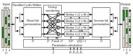 - Kang, H.-J.; Yang, B.-D. Low-complexity, high-speed multi-size cyclic-shifter for quasi-cyclic LDPC decoder. Electron. Lett. 2018, 54, 452–454. [Google Scholar] [CrossRef]