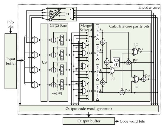 Calculated core parity bits are returned to the main CS input since they are used for additional parity bits calculation. One of the four core parity bit groups is selected based on the control CPM data. Depending on the lifting size, the selected core parity bits group is copied in the same way as it has been for information bits in the input buffer. Finally, four sets of multiplexers determine whether the information bits group or the core parity bits group should be passed to the CS. Outputs of the “GF(2) Sum” block are now additional parity bits, which are passed to the output codeword generator.