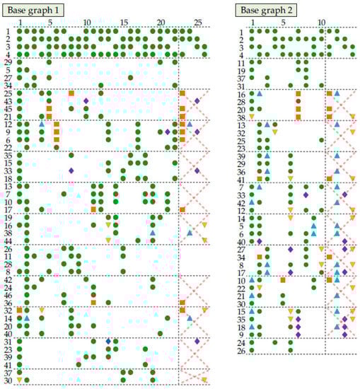 There are two base graph matrices (BG1 and BG2) available from which all codes are derived. Each base graph matrix has a corresponding set of base exponent matrices. The set includes one matrix for each possible value of parameter a from (20), defined for the corresponding maximum lifting size (256, 384, 320, 224, 288, 352, 208, or 240). Every exponent matrix contains nonnegative and negative entries. Nonnegative entries represent the values by which the corresponding identity submatrices are circularly shifted. All other entries are equal to −1 and represent zero submatrices. The structure of a base exponent matrix is
