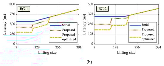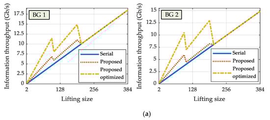 The proposed encoder was implemented on the Xilinx ZCU111 development board with the Zynq UltraScale+ RF-SoC device (XCZU28DR). The obtained maximum clock frequency was fmax = 580 MHz. Throughput results for both BG1 and BG2 codes (the entire PCM) are summarized in Figure 13a. Results are shown for all available lifting size values. The information throughput is calculated as in (32). The peak BG1 throughput is 18.51 Gb/s, whereas the peak throughput for BG2 is 14.87 Gb/s. Figure 13a shows a significant improvement of the throughput results for lifting sizes smaller than or equal to 192 when the proposed flexible partially parallel encoder is compared to the serial processing. High throughput values are achievable for much smaller lifting size values since CS resources are better used for parallelism increase. The benefits of processing order optimization are also easily noticeable.