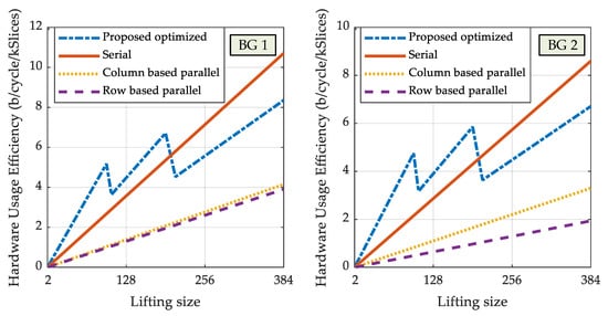 Finally, Figure 14 shows the normalized HUE depending on the lifting size for all the above architectures. It is obvious that highly parallel architectures are very inefficient, when compared to the serial and proposed partially parallel architecture. Considering the fact that the latency of the serial processing architecture and the proposed partially parallel architecture is lower than 1 µs for all codeword lengths, and the fact that the air interface requirement for 5G ultra-reliable low-latency communication (URLLC) use case is 1 ms [47], which is 1000 times higher, there is no remaining reason to use highly parallel architectures for 5G LDPC encoding. By placing multiple encoders to work in parallel, the proposed architecture can be used for obtaining the throughput that is even higher than the throughput of the highly parallel architectures but with much fewer hardware resources.
