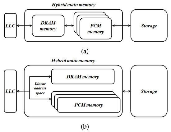 Although PCMs have attractive advantages, such as low leakage power, high density, byte-addressability, and non-volatility, to replace DRAMs in embedded systems [12,13,14], they have disadvantages, such as high read/write latency with even asymmetric operation cycle requirement and limited write endurance. Thus, it is difficult to adopt PCMs in write-intensive systems because the write endurance of each cell in the PCM is approximately 108–109. Therefore, existing research has been focused on controlling the write operations of PCMs and providing improved access latency and write endurance by altering their hardware design. Nevertheless, PCMs cannot completely replace DRAMs in the main memory architecture owing to the advantages of DRAMs, such as unlimited write endurance and low read/write latency. Hence, recent research has proposed a hybrid main memory architecture to improve the limitations of PCMs and DRAMs by selectively exploiting their advantages.