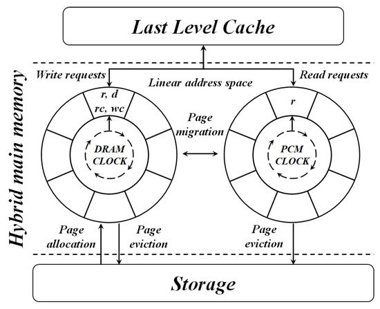 - Lee, M.; Kang, D.H.; Kim, J.; Eom, Y.I. M-CLOCK: Migration-optimized page replacement algorithm for hybrid DRAM and PCM memory architecture. In Proceedings of the 30th Annual ACM Symposium on Applied Computing, Salamanca, Spain, 13–17 April 2015; pp. 2001–2006. [Google Scholar]