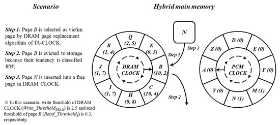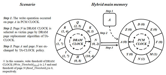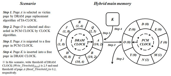 In this section, we provide representative scenarios of the TA-CLOCK proposed in this paper. In these scenarios, pages that are allocated to the DRAM CLOCK are marked as P(x, y), where P represents the logical page number of each page. In the DRAM CLOCK pages, x and y represent the read and write counts, respectively. However, in the PCM CLOCK pages, x denotes the reference bits. In the presented scenarios, we assumed that the victim page of the DRAM CLOCK is already selected by the DRAM page replacement algorithm of the TA-CLOCK.