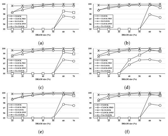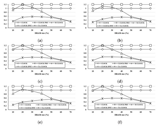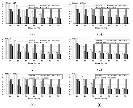 Figure 9 shows the write hit ratio of DRAM in the hybrid main memory. When frequent write operations occur in the PCMs of hybrid main memories, the performance of embedded systems is reduced, and it is difficult to utilize the limited lifespan of PCMs. Therefore, in embedded systems with hybrid main memories, research has been conducted toward designing write operations to occur in DRAM. In our experiments, TA-CLOCK had a higher DRAM write hit rate than other techniques, with averages of 21.1%, 19.6%, 0.3%, and 0.4% compared with those of CLOCK, CLOCK-Pro, M-CLOCK, and CLOCK-DWF, respectively, as shown in Figure 9. From this result, we can infer that TA-CLOCK effectively maintains write pages in the DRAM CLOCK by classifying the page access tendency of the victim page. Consequently, it reduces the PCM write count and the number of migrations between the DRAM and PCM, as observed in Figure 6 and Figure 8.
