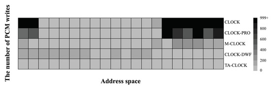 When write operations frequently occur to a specific area of hybrid main memories, the write endurance of the system is reduced. TA-CLOCK alleviates the non-uniformity of write operations on a specific page by reducing the number of write operations in PCMs. Figure 7 shows the number of PCM writes, grouped by block units. TA-CLOCK shows the least number of write operations to whole areas of PCM, and write operations are evenly distributed. Table 7 described the average write counts and standard deviation on the PCM for each page replacement policy.