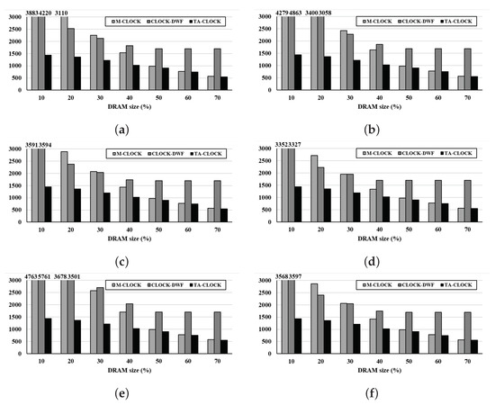 Figure 6 shows the number of write operations in the PCM of the TA-CLOCK compared with those of CLOCK, CLOCK-Pro, M-CLOCK, and CLOCK-DWF. The TA-CLOCK reduced the number of write operations in the PCM by averages of 93.6%, 92.1%, 41.6%, and 58.7% compared with those of CLOCK, CLOCK-Pro, M-CLOCK, and CLOCK-DWF, respectively. This shows that TA-CLOCK effectively performs state classification using Equations (1) and (2). Hence, it can utilize the limited endurance of PCM in the hybrid main memory of embedded systems.