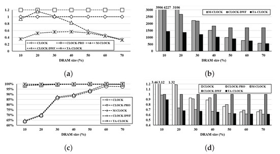The contributions of TA-CLOCK include reduction in the number of write operations in the PCM, which positively affects the write endurance and write latency, and reduction of the energy consumption of embedded systems. Figure 11 shows the average results of all workloads in the hybrid main memory. In the experiment results, TA-CLOCK efficiently reduced the number of write operations in the PCM by reducing the number of unnecessary migrations between the DRAM and PCMs. Additionally, it improved the hit ratio of write operations in the DRAM and enhanced the EDP. As shown by the average results in Figure 11a, the TA-CLOCK reduced the number of write operations in the PCM by 71.5% on average compared with other policies. Figure 11b shows the normalized migration counts between DRAM and PCM. The TA-CLOCK reduced the number of migrations by 57.3% on average compared with CLOCK-DWF and M-CLOCK. Figure 11c shows the hit ratio of the write operations in the DRAM. The TA-CLOCK improved the write hit ratio in the DRAM by 10.4% on average, compared with other policies. Finally, Figure 11d shows the normalized EDP in the hybrid main memory. In this experiment, TA-CLOCK reduced the EDP by 38.3% on average. Based on these results, TA-CLOCK improves the limited lifespan of PCMs with enhanced EDP compared with other policies.