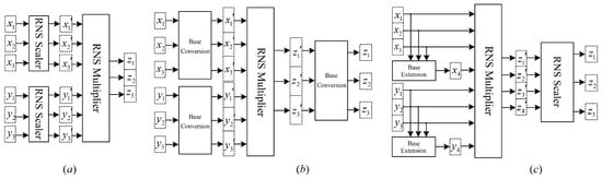 Three traditional overflow-free RNS multipliers. (a) Scaling-based scheme, (b) Base Conversion-based scheme, (c) Base Extension-based scheme