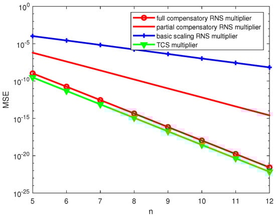 In (39) and (40), represents real results of ith calculation, represents ith result calculated by the three multipliers, while and represent the unit normalization of and , respectively. For each i, the inputs of the multiplier are randomly selected from RNS’s dynamic range. N is the total number of samples calculated for each n, in this paper, 10,000. The dynamic range of RNS is changed by n from 5 to 12. For comparison, the bit-width k of TCS is selected to guarantee that the dynamic range of TCS is slightly bigger than that of RNS. For example, for , the moduli set of the RNS is ; then, 32,736, and we choose bit in order to compare with TCS. The simulation results are shown in Figure 6 and Figure 7.