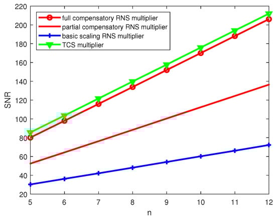 As shown in Figure 7, for each n, the proposed RNS multiplier outperforms the traditional way by about 50–140 dB when n increases from 5 to 12, which reveals that the proposed RNS multiplier can greatly improve the calculation precision of the multiplication in RNS and avoid the overflow at the same time. In addition, the proposed multiplier achieves an SNR curve similar to that of the TCS multiplier, with an SNR loss of about 5 dB. This is because the dynamic range of TCS is chosen to be slightly larger than that of the RNS. Moreover, as mentioned before, the hardware consumption of proposed RNS multiplier can be saved by abandoning the third add item in (29) and (33). Although this can lead to a loss of calculation precision, the result shown in Figure 7 suggests that our partial compensatory RNS multiplier still outperforms the basic scaling one.