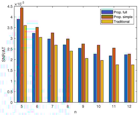 In Table 3, Structure 1 means the structure in (29) and its simplified version, and Structure 2 means the structure in (33) and its simplified version. Although structures of two multipliers are symmetrical, they use different numbers of modulo and adders. Moreover, two cascaded modulo adders can benefit from the optimal hardware structure in Figure 5, so the hardware consumption of is slightly larger than that of for each n. BS means basic scaling RNS multiplier, PC means partial compensatory RNS multiplier and FC means full compensatory RNS multiplier. We use the of basic scaling RNS multiplier with structure 1 as a basis to calculate the ratio for each n. From Table 3, for each n, although the proposed multiplier needs about 2–2.3 times hardware consumption compared with the basic scaling multiplier, it can get about 2.6–3 times SNR than that of the basic scaling multiplier. To further evaluate the hardware efficiency of the proposed RNS multiplier, we calculate the of three multipliers. The results are shown in Figure 8. We can see that the proposed partial compensatory RNS multiplier has the biggest for each n, which means it has the highest hardware efficiency. In addition, the proposed RNS multiplier has bigger than that of the basic scaling one. This indicates that our proposed RNS multiplier still outperforms basic scaling RNS multiplier in hardware efficiency.