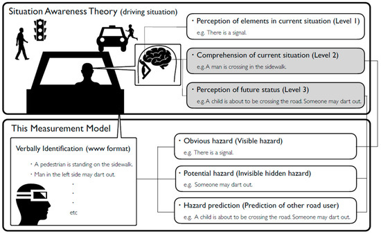 Situation awareness theory is the model that humans make a decision based on a combination of individual factors and the perception of elements in the current situation (Level 1), comprehension of the current situation (Level 2), and perception of future status (Level 3) (please refer to Figure 1) [14,15]. Therefore, it is important to identify whether the hazard perception test can show the actual driving situation or not. It is essential to establish and implement the hazard test in which the subject can feel like they are driving on the road. Hazard perception is usually evaluated by showing a video to the participants [6,8,9]. Virtual reality (VR), such as video clips, is useful for facilitating situation awareness. The virtual environment can create presence, which is a state of consciousness, the (psychological) sense of being in the virtual environment [16,17]. This sense is useful for conducting a hazard perception test because it allows the subject to feel like they are driving on the road.